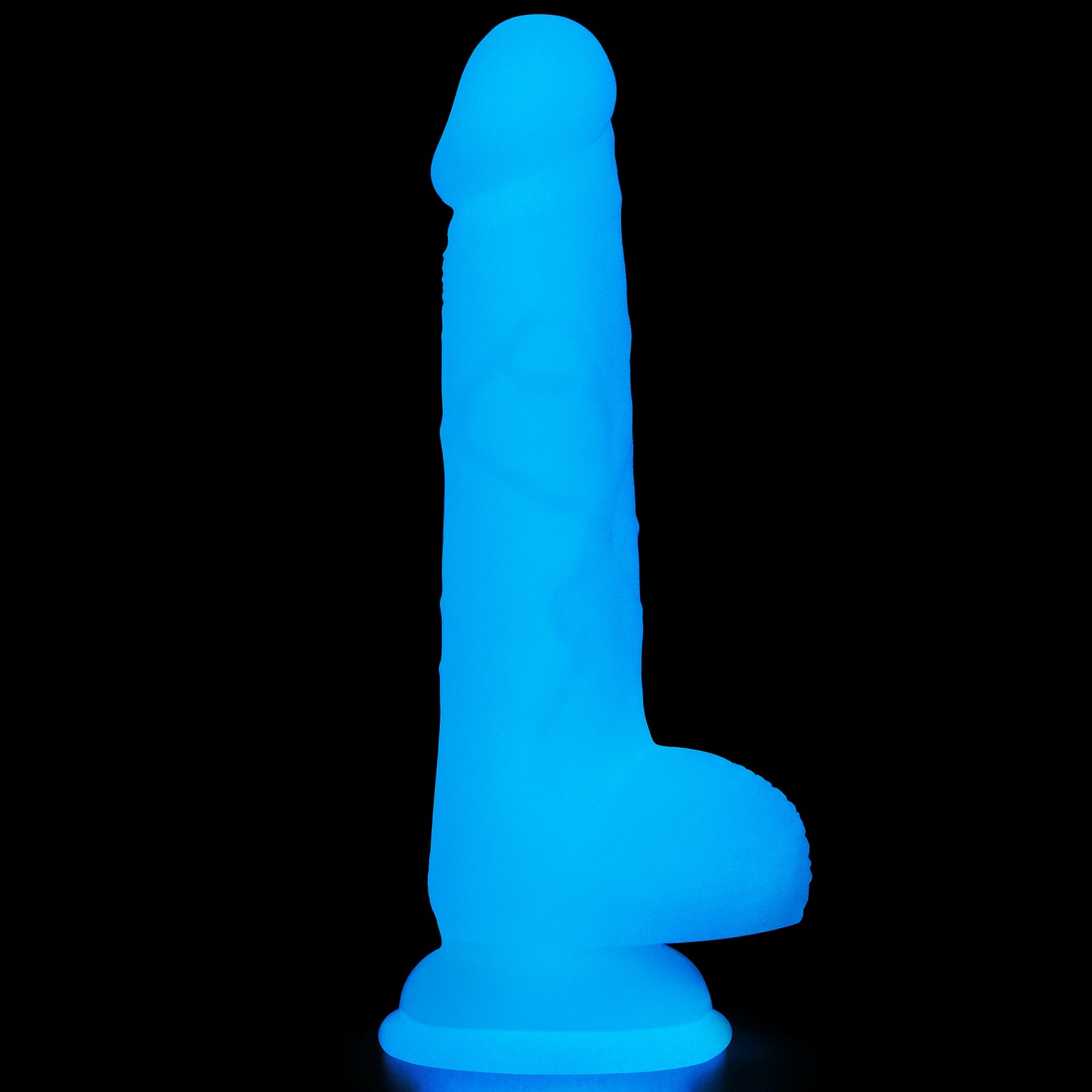 • The 7 inches lumino play silicone dildo emits blue fluorescence