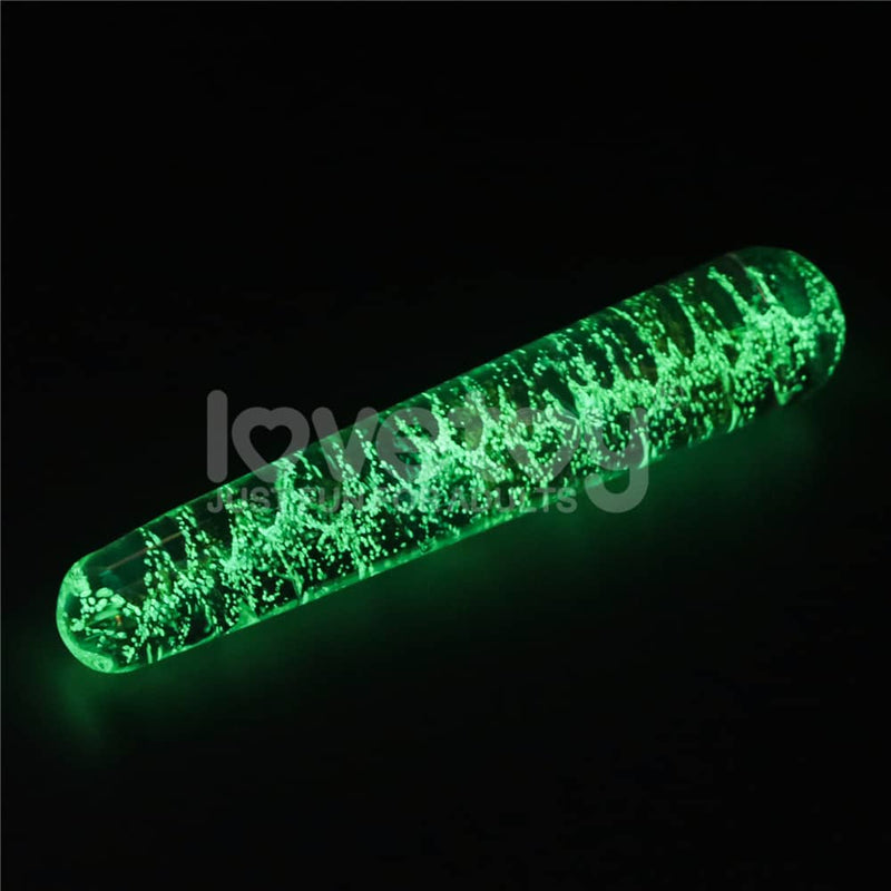 • The luminous twilight gleam glass slim dildo glowing the green light lays flat