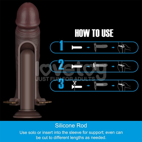 The insertable silicone rod can also act as an erection aid, filling the air gap between the head of your penis and the end of the sleeve. You can cut off the suction cup and trim the rod to different lengths, allowing you to customize it to fit your size inside the sleeve.